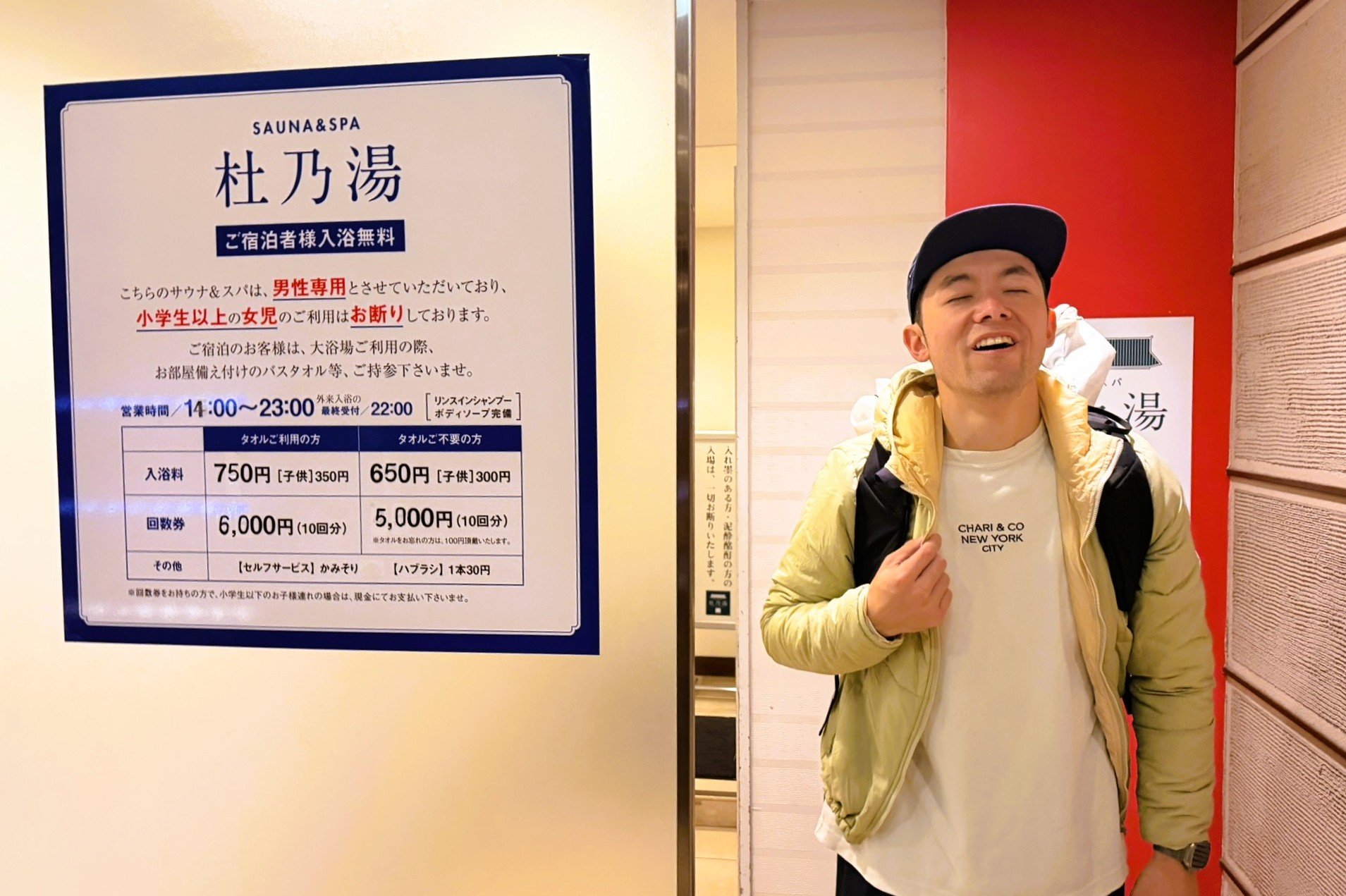 今回の旅は、ゴール後に荷物を預けていたホテルアムゼ 新山口でピックアップ。その後は日帰り温泉に立ち寄り、汗を流して体をしっかり温める。