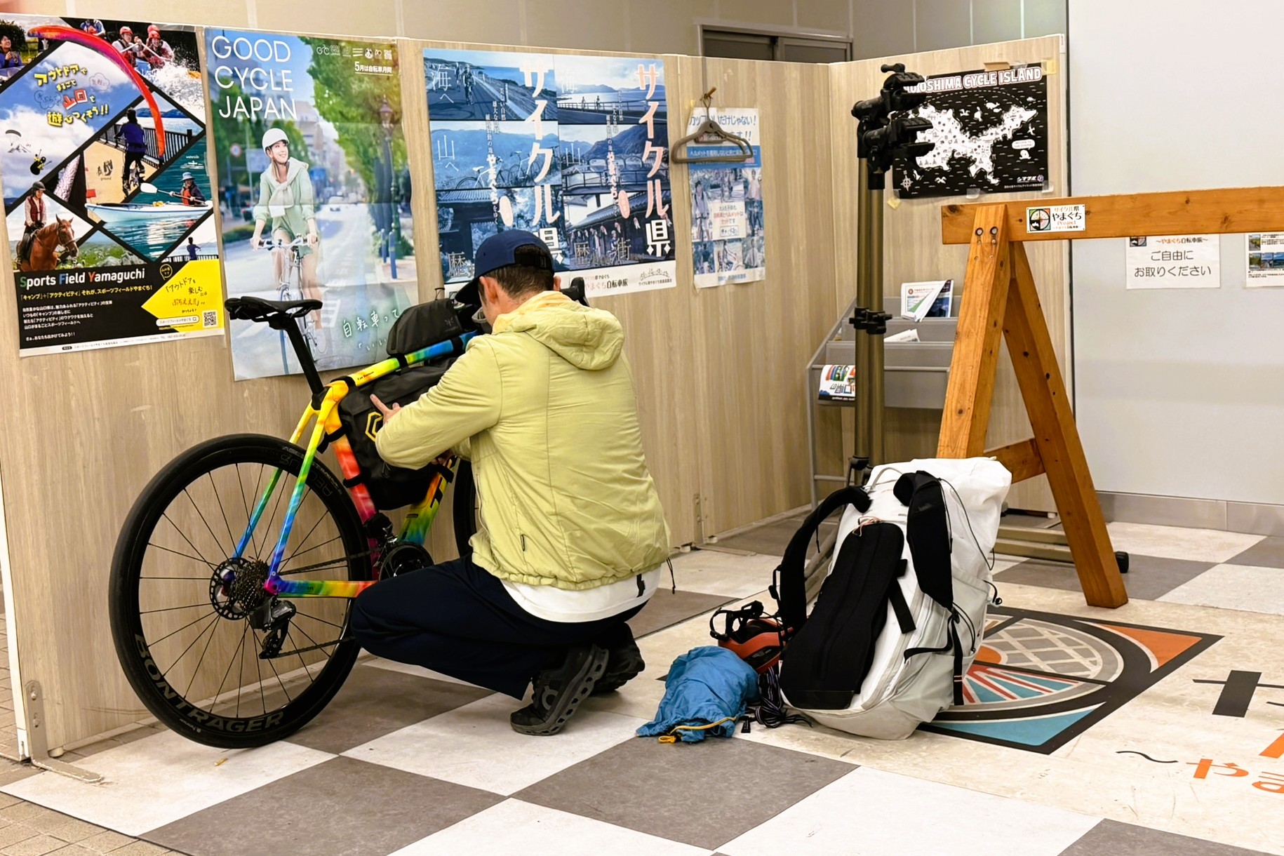 新山口駅にあるサイクルステーションで、電車輪行の準備を開始。すぐ隣にエレベーターもあり、改札口までのアクセスはとてもスムーズ。輪行派にとっては、申し分のない環境だ。