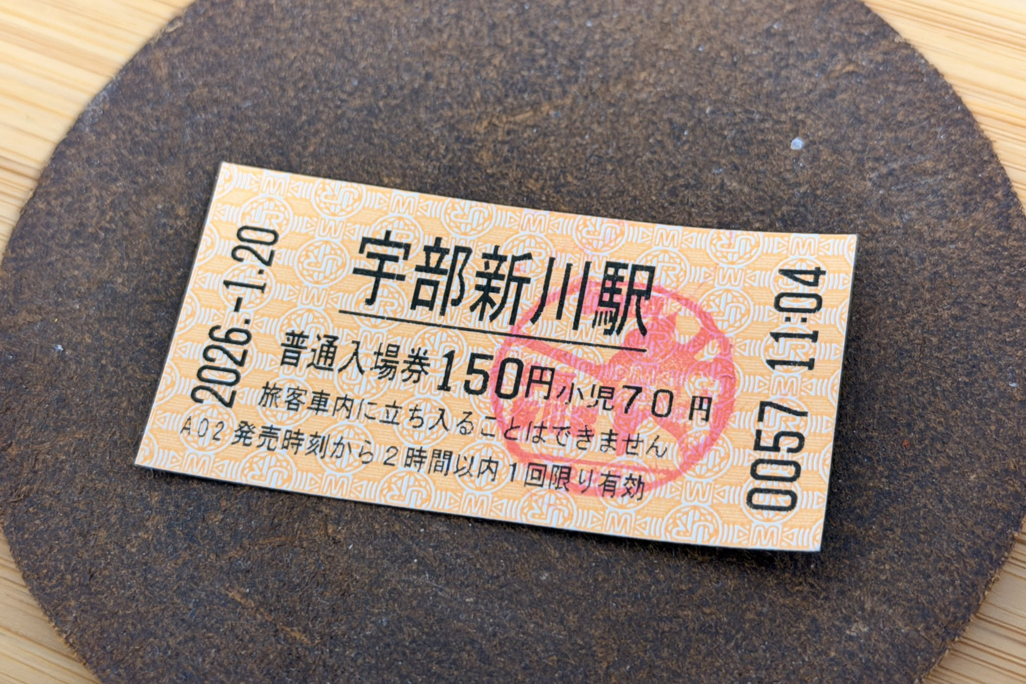 ちなみに宇部新川駅では、入場券を購入すると駅員さんが切符にスタンプを押してくれるのだが、その印がなんと エヴァ初号機の横顔という特別仕様。思いがけないところにも“エヴァ推し”が仕込まれていた。