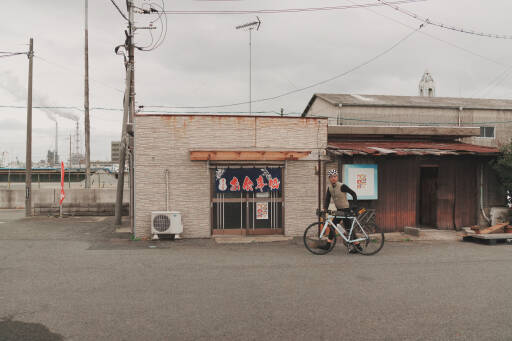 珍しい踏み切りを見て興奮し、再び走ってきた道を戻りランチスポットへ向かう。改めて工業地帯の道路を走っていると工業地帯の無骨な建造物を庵野監督は幼少期の頃に見たことによってエヴァンゲリオンの世界観ができたのではないかと思ってしまう。